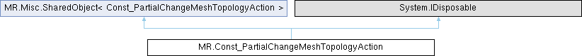 Undo action for efficiently storage of partial change in mesh topology (e.g. a modification of small region) Generated from class MR.PartialChangeMeshTopologyAction. Base classes: Direct: (non-virtual) MR.HistoryAction This is the const half of the class.