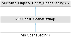 Inheritance diagram for MR.SceneSettings:This singleton struct contains default settings for scene objects Generated from class MR.SceneSettings. This is the non-const half of the class.